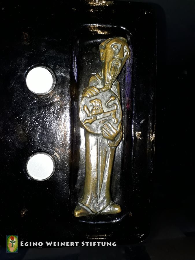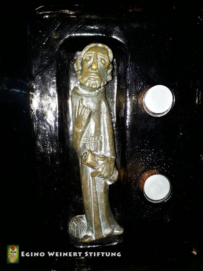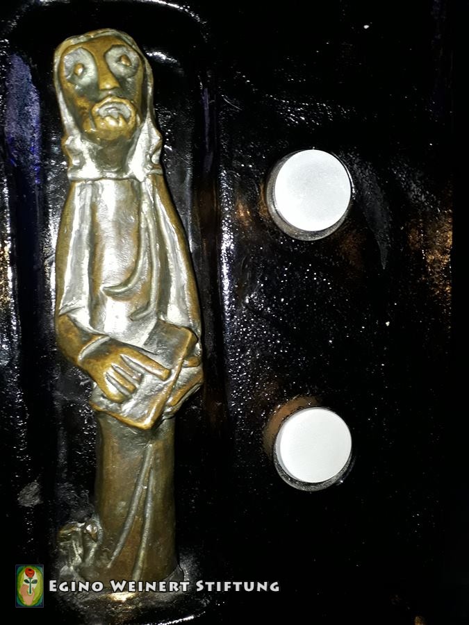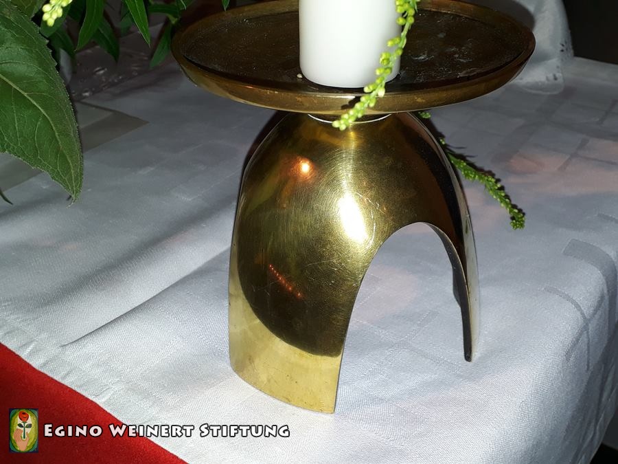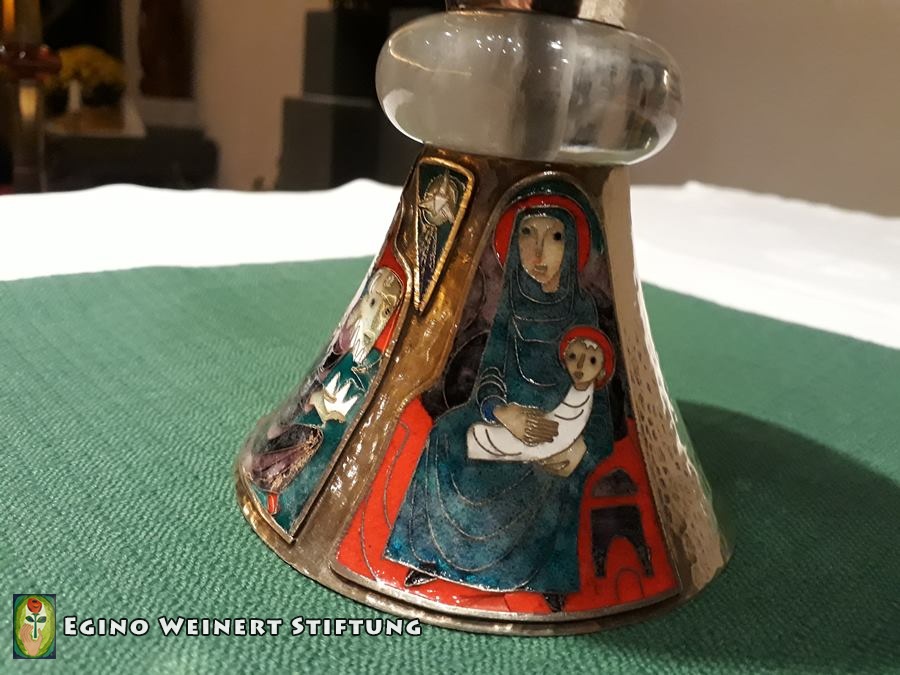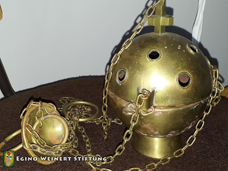 Sakristeiglocke, Kerzenständer, Weihwasserkessel und Weihrauchfass stammen ebenso aus der Werkstatt Weinert. Zwischen 1957 und 1962.