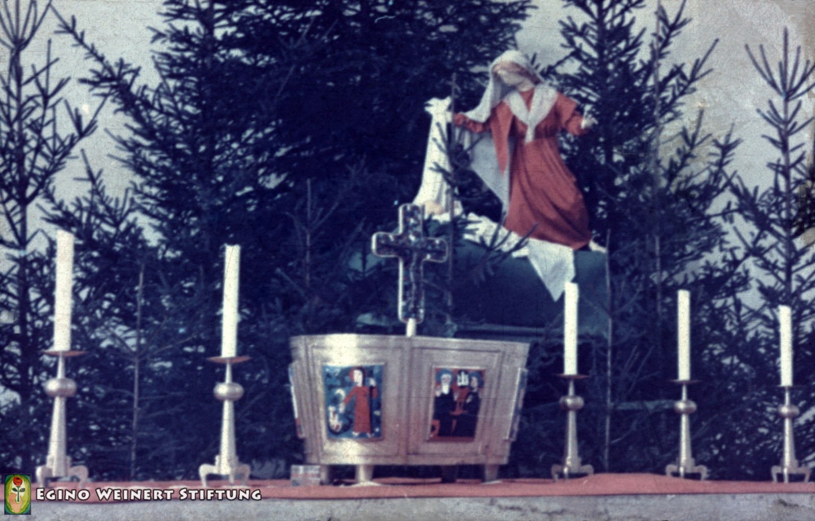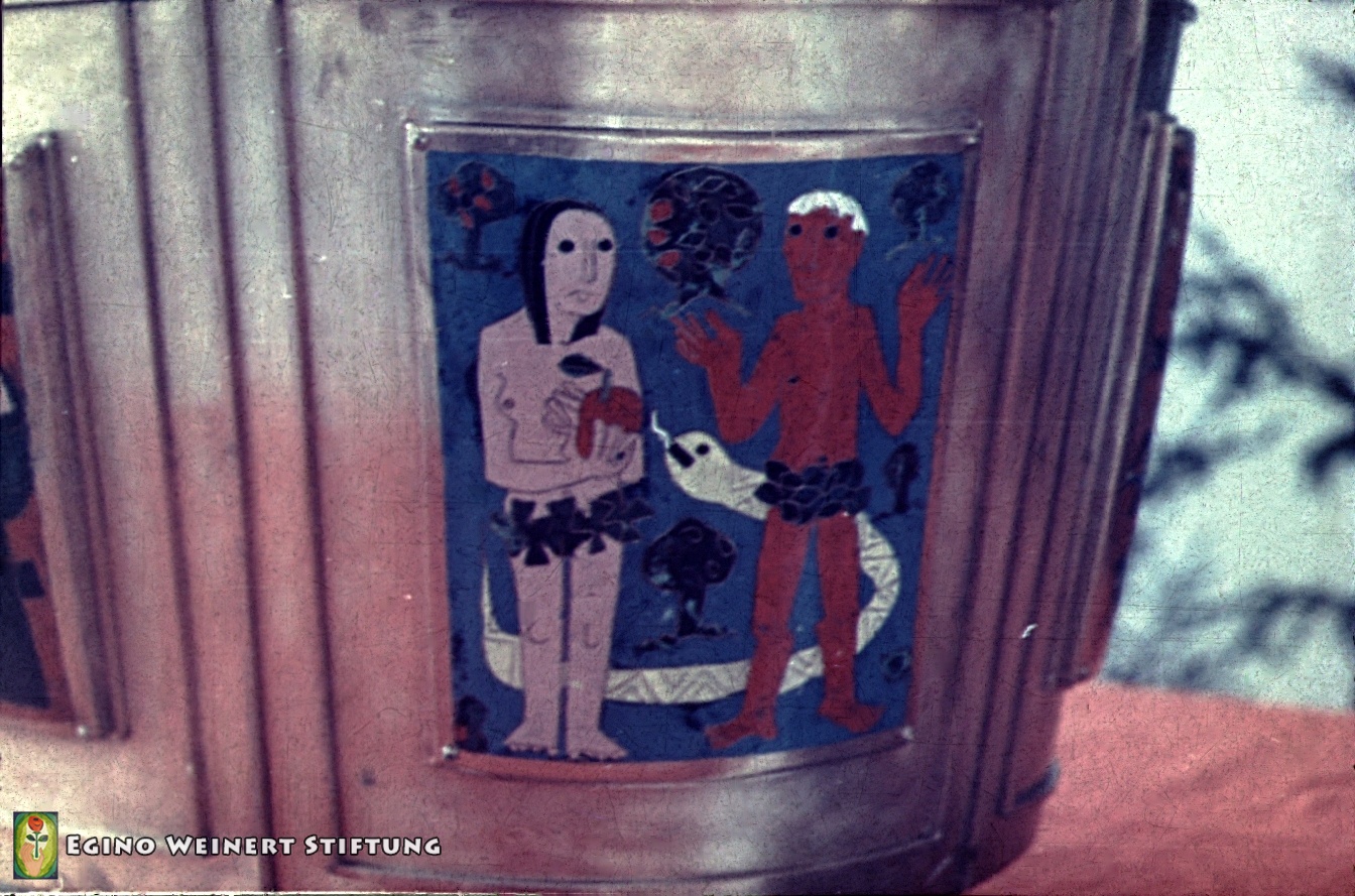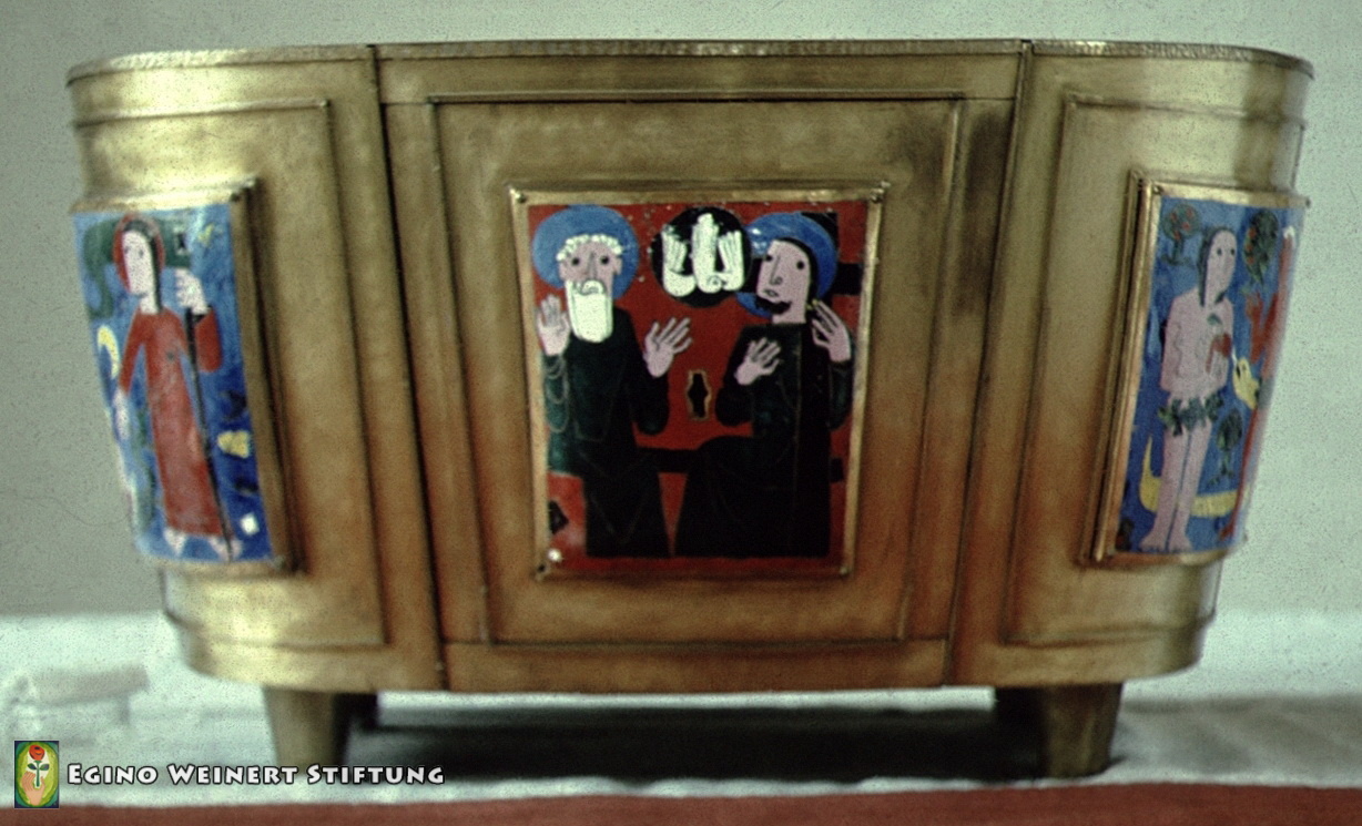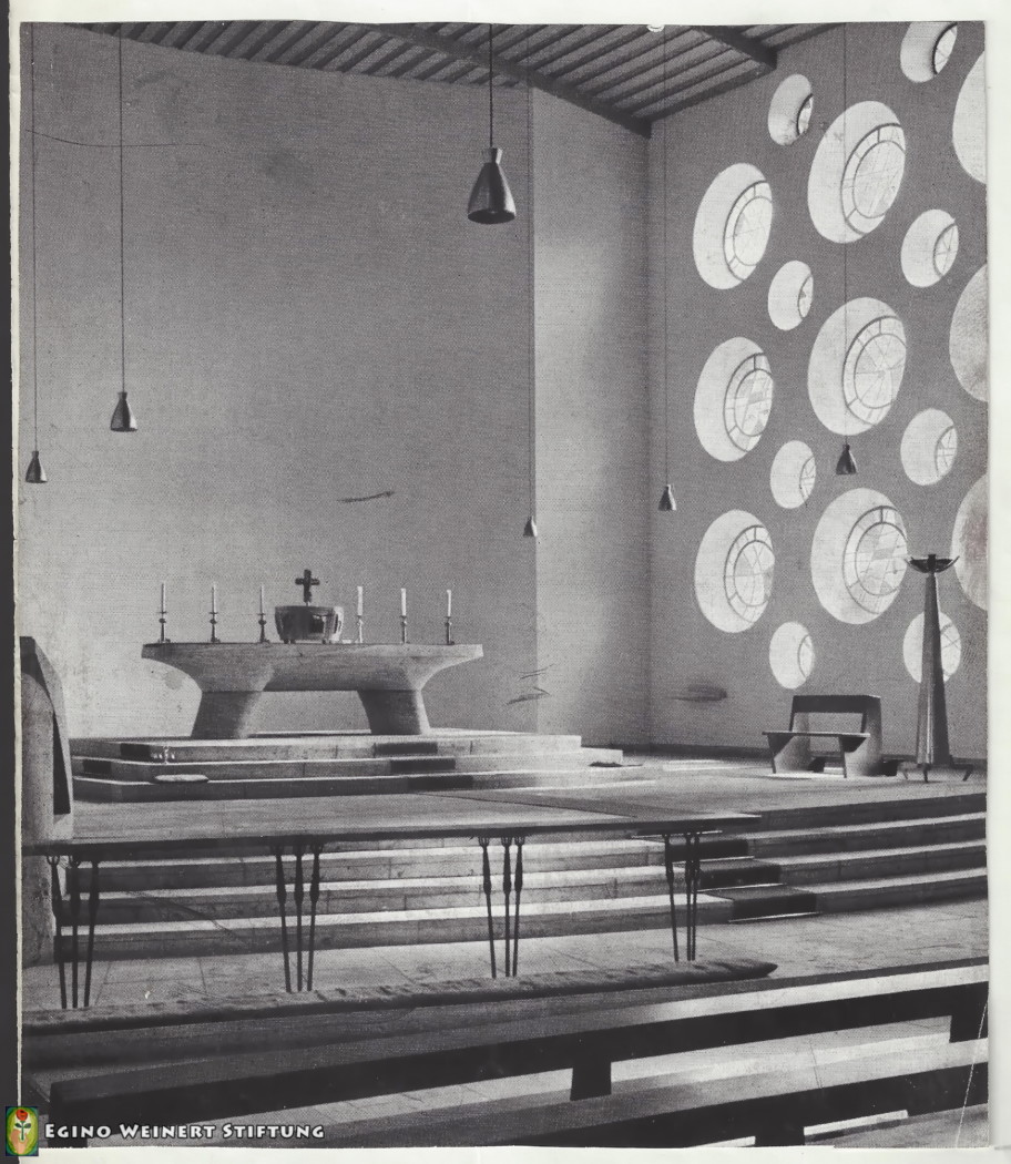 Seit 1953 sind der Tabernakel, Leuchter, ein Altarkreuz und ein Vortragekreuz von Egino Weinert in der Kirche.
