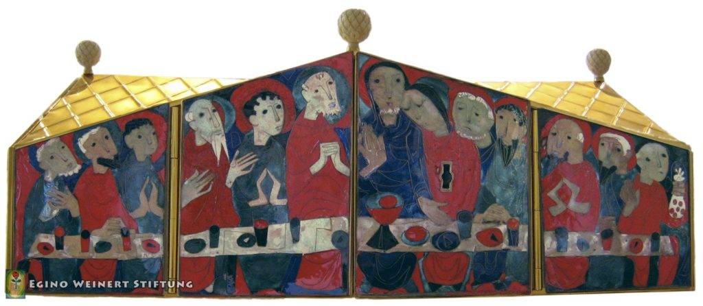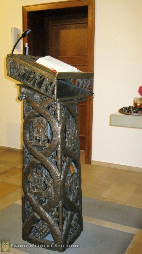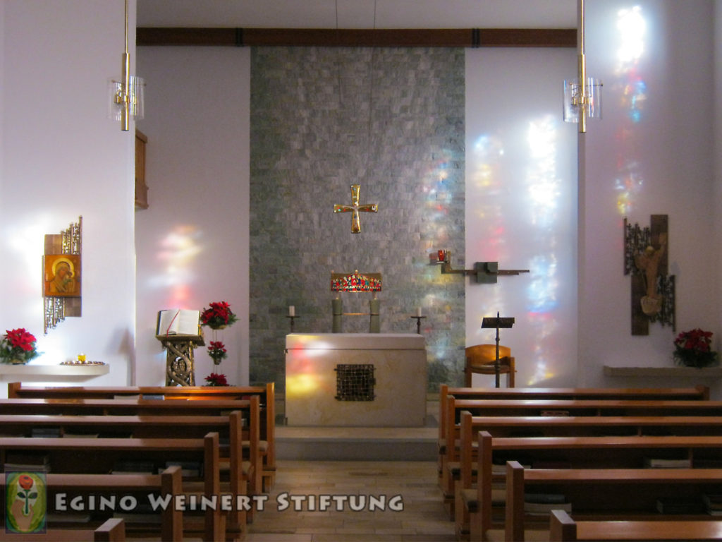 In dieser Kapelle finden wir einen Ambo, einen Tabernakel und ein Hängekreuz über dem Altar von Egino Weinert.