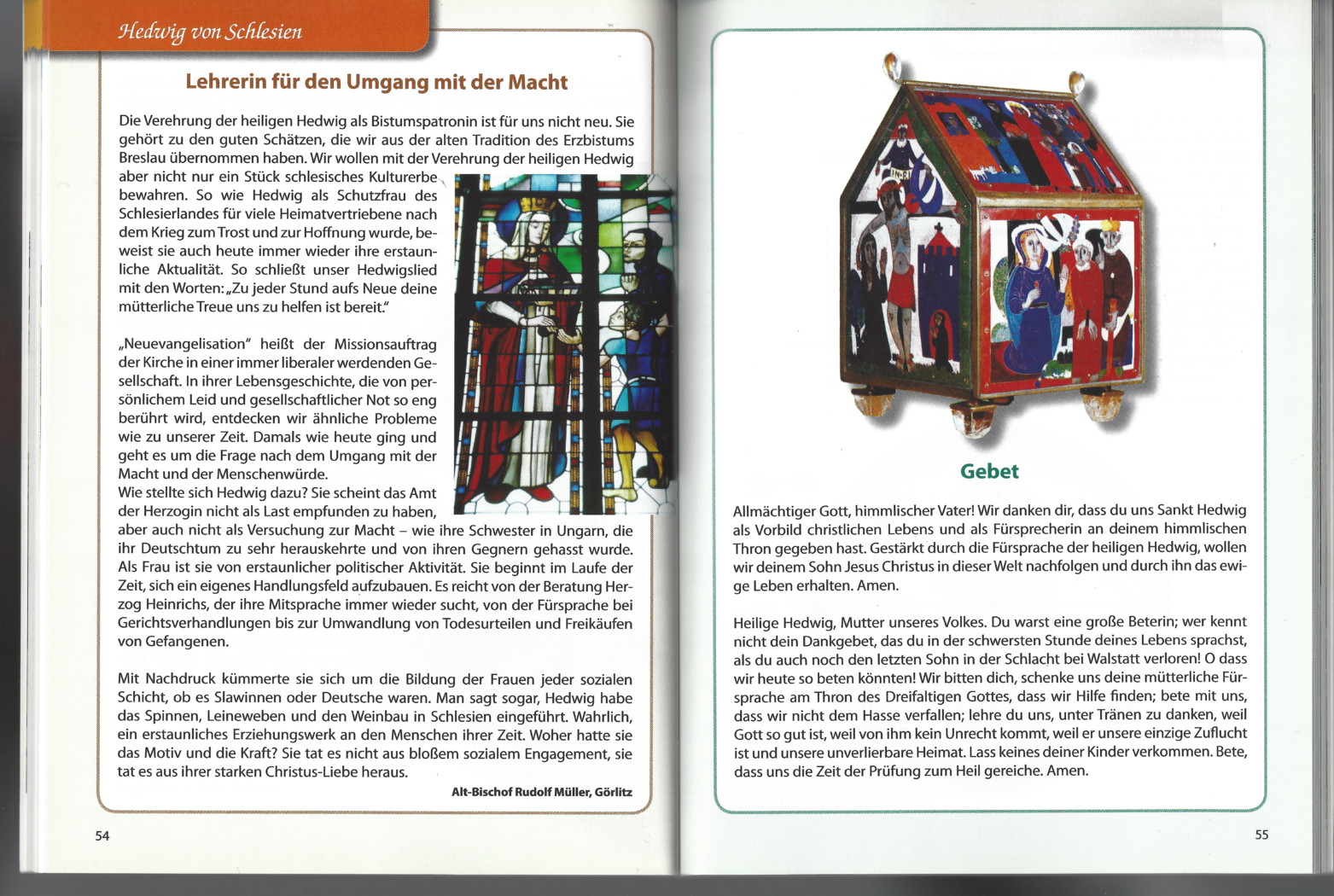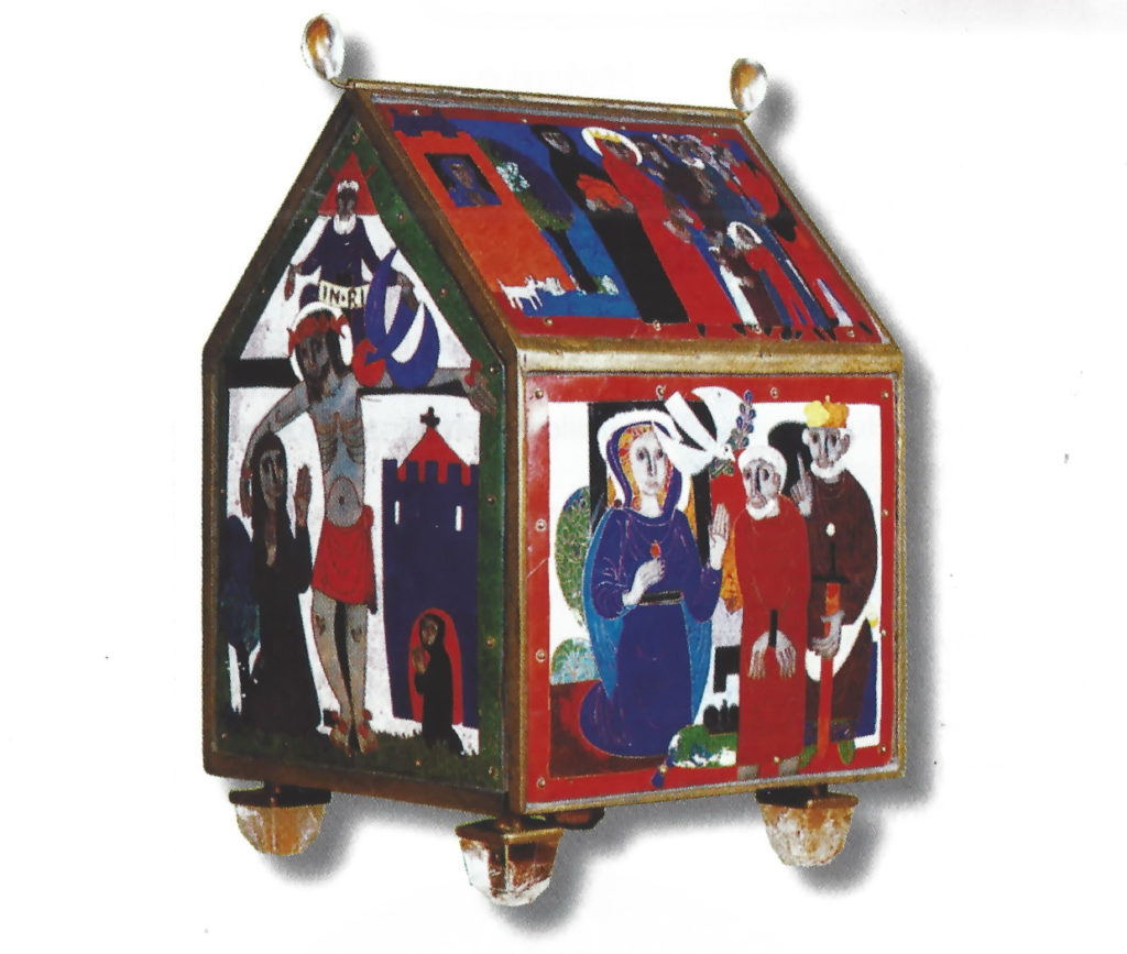Das Reliquiar birgt ein Stückchen vom Haupt der heiligen Hedwig. Der bekannte Kölner Künstler Egino Weinert hat es 1982 für unsere Gemeinde geschaffen. Es hat die Form eines kleinen Hauses, etwa 30 cm hoch und 20 cm breit. Alle 6 Flächen zeigen Emaillearbeiten mit Darstellungen aus dem Leben der heiligen Hedwig.