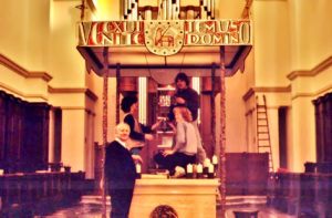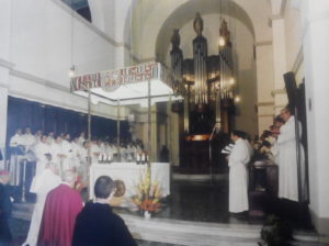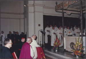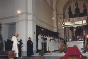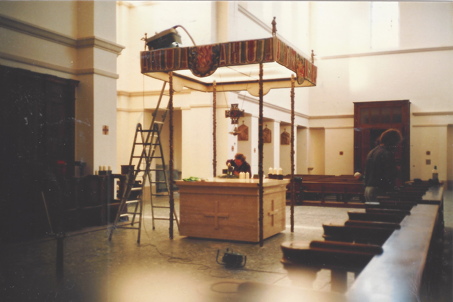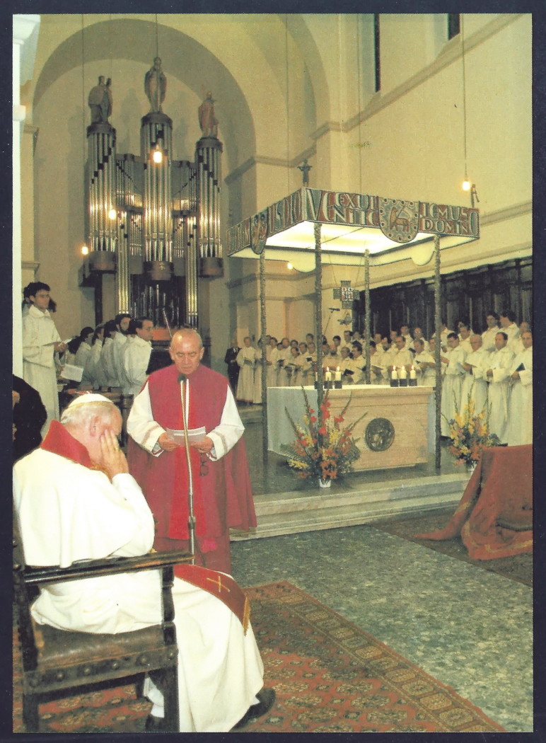 1985 wurde die päpstlische Musikschule von Egino Weinert mit einem Hängekreuz, einer darunter befestigten „Eucharistischen Taube“, Baldachinstelen, einer Ronde am Altar und Altarleuchtern ausgestattet. Dabei begegnete er Papst Johannes Paul dem II.