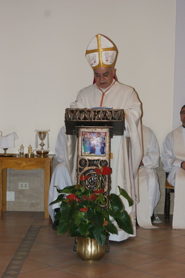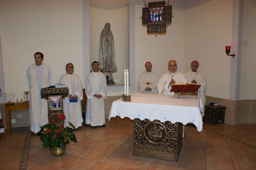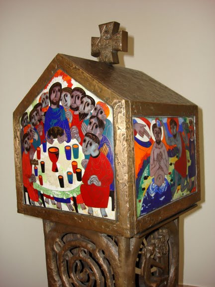 Rom – Portugiesisches College „Lusitanum“ Portugiesisches College „Lusitanum“, in Rom Via Nicolò V, 3 Hier finden wir einen Altar, einen emaillierten Tabernakel, ein Hängekreuz, einen Ambo und die dazu passenden Sedilien. alte Aufnahme <- zurück
